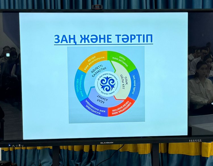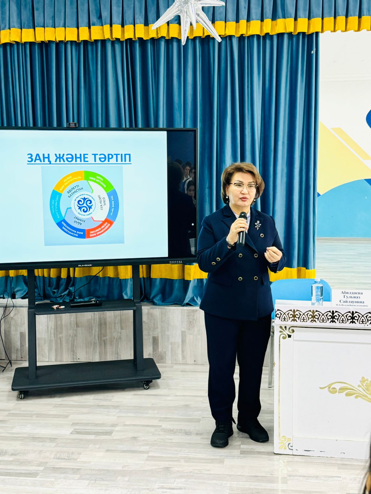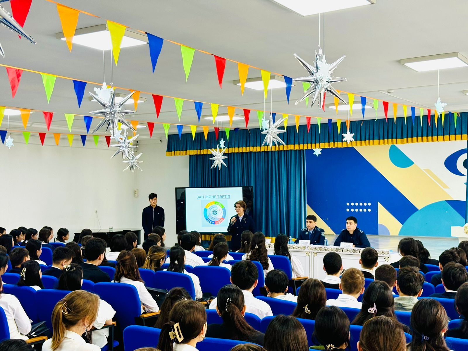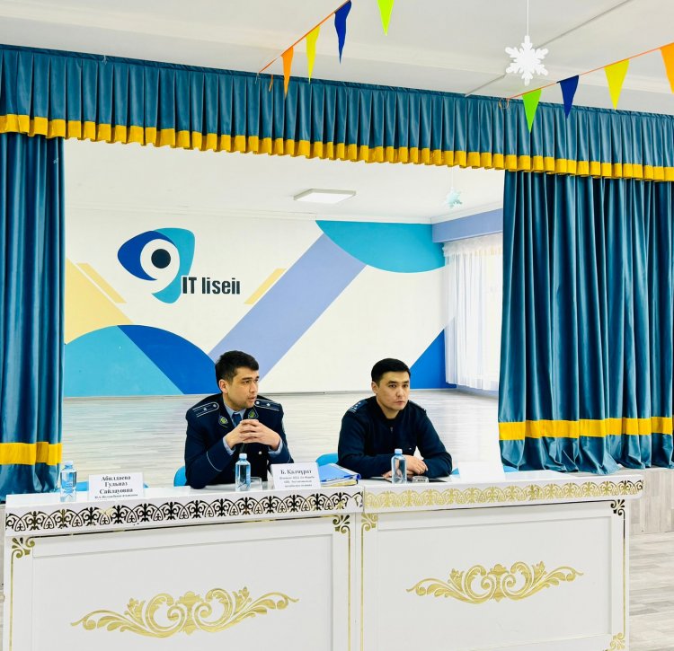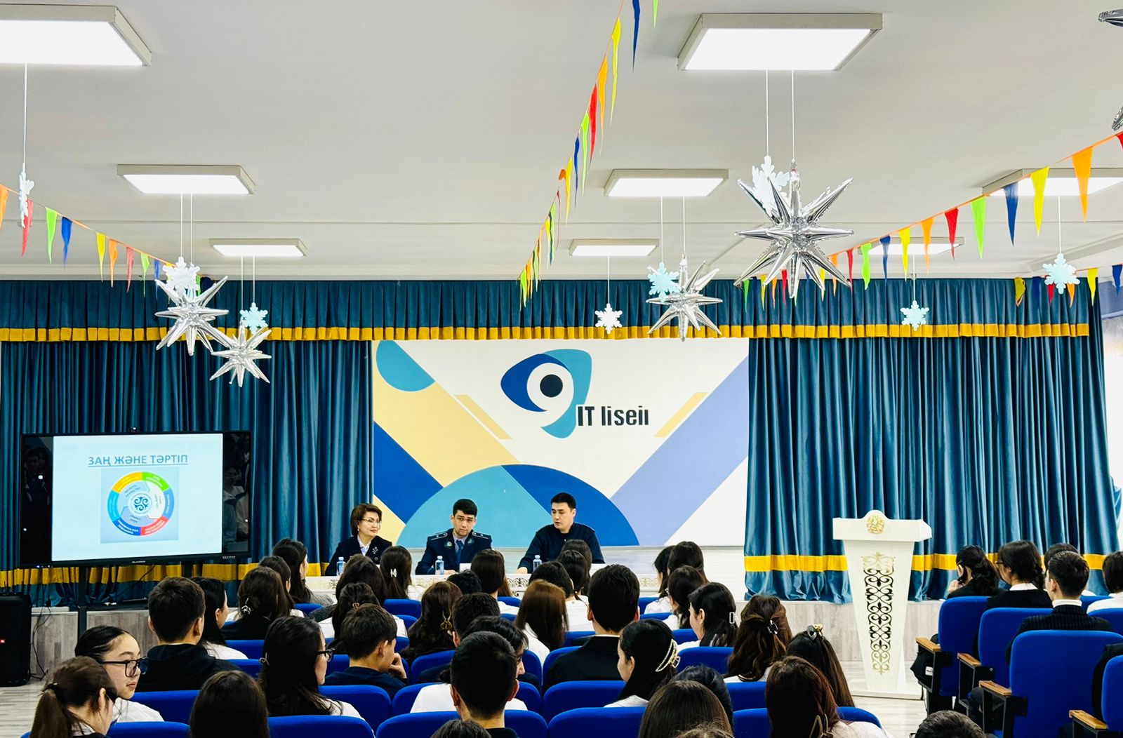 Шымкент қаласы білім басқармасына қарасты Ө.А.Жолдасбеков атындағы N9 IT лицейінде 29.01.2025ж. "Біртұтас тәрбие" бағдарламасының "ЗАҢ жәнеТӘРТІП" тақырыбындағы айлық аясынд" кәмелетке толмағандардың арасында құқықтық мәдениет негізін қалыптастыру мақсатында жастардың сауаттылығын арттыруға "Заң және Тәртіп" тақырыбында 9-10 сынып оқушыларымен кездесу өтті. Іс-шараға Шымкент ҚПД
