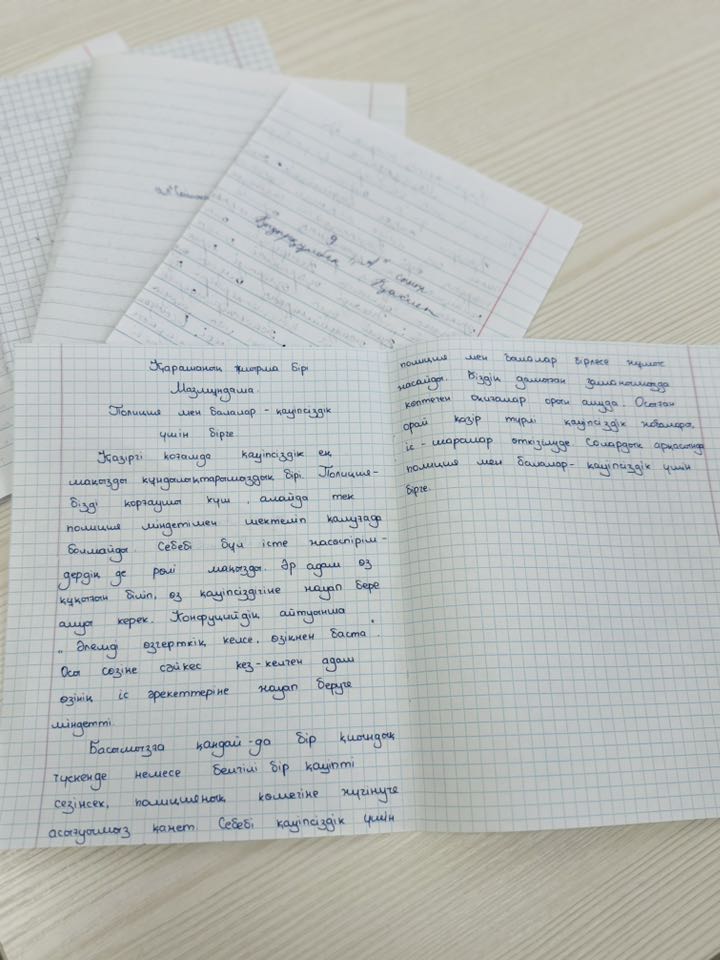 21 қараша күні сағат 11.00-де 7-11 сынып оқушылары арасында «Полиция және балалар бірге – қауіпсіздік үшін» тақырыбында бірыңғай мазмұндама жазу ұйымдастырылды. Мақсат – оқушыларға құқықтық мәдениетті, қауіпсіздік қағидаларын насихаттау, заңға деген құрмет пен жауапкершілік сезімін қалыптастыру. Үздік жұмыстар арнайы іріктеліп, білім беру қоғамдастығымен бөлісілді. Бұл бастама балалар мен полиция арасындағы өзара сенім мен әріптестік байланысын нығайтып, қоғамдағы бейбітшілік пен қауіпсіздіктің басты кепілі екендігін көрсетті.