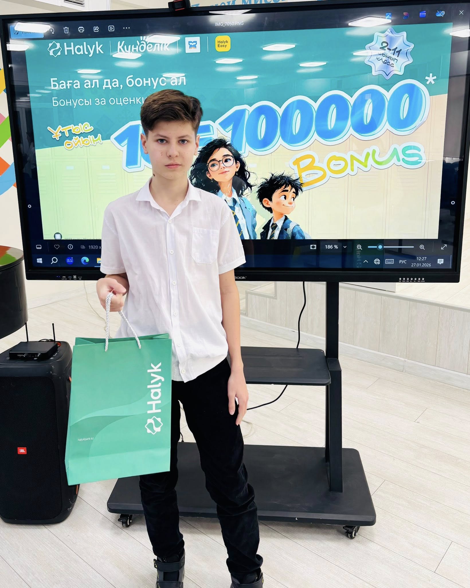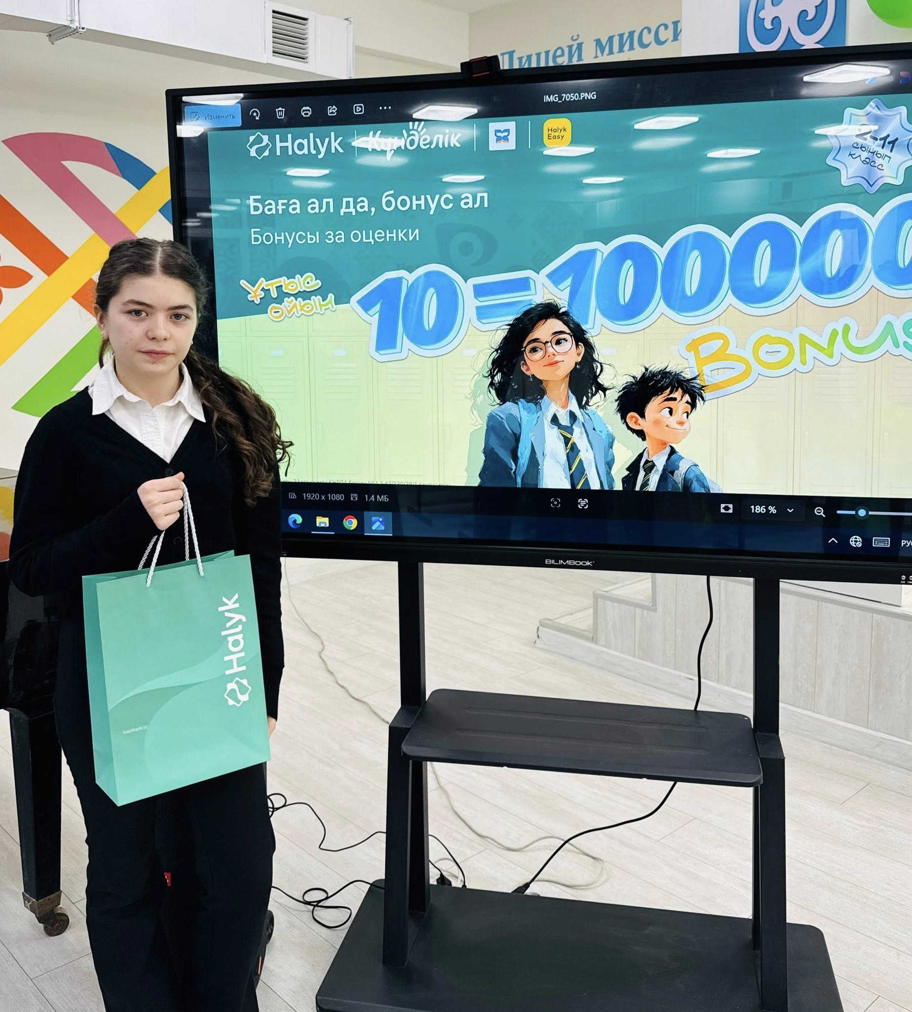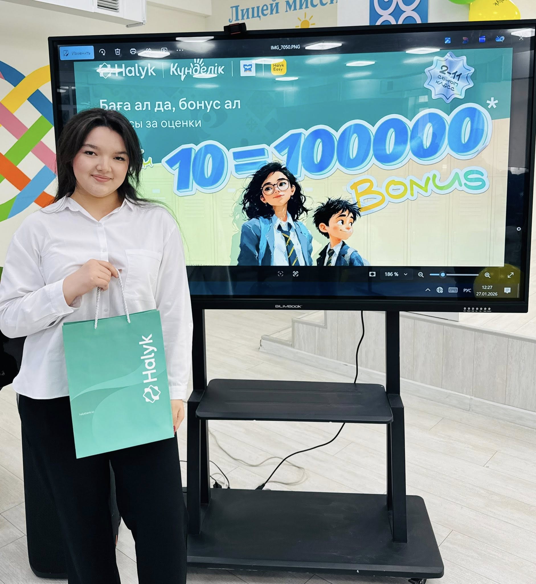 оқушыларымызды Халық банк өкілдері келіп , 100 000 бонус(100 000 тг) табыстады. Бұл оқушылардың  оқу жетістіктерін  көрсетуге және шыңдауға керемет ынталандырушы болды. Халық банк өкілдеріне шынайы ықылас  білдіре отырып, АЛҒЫС  айтамыз
