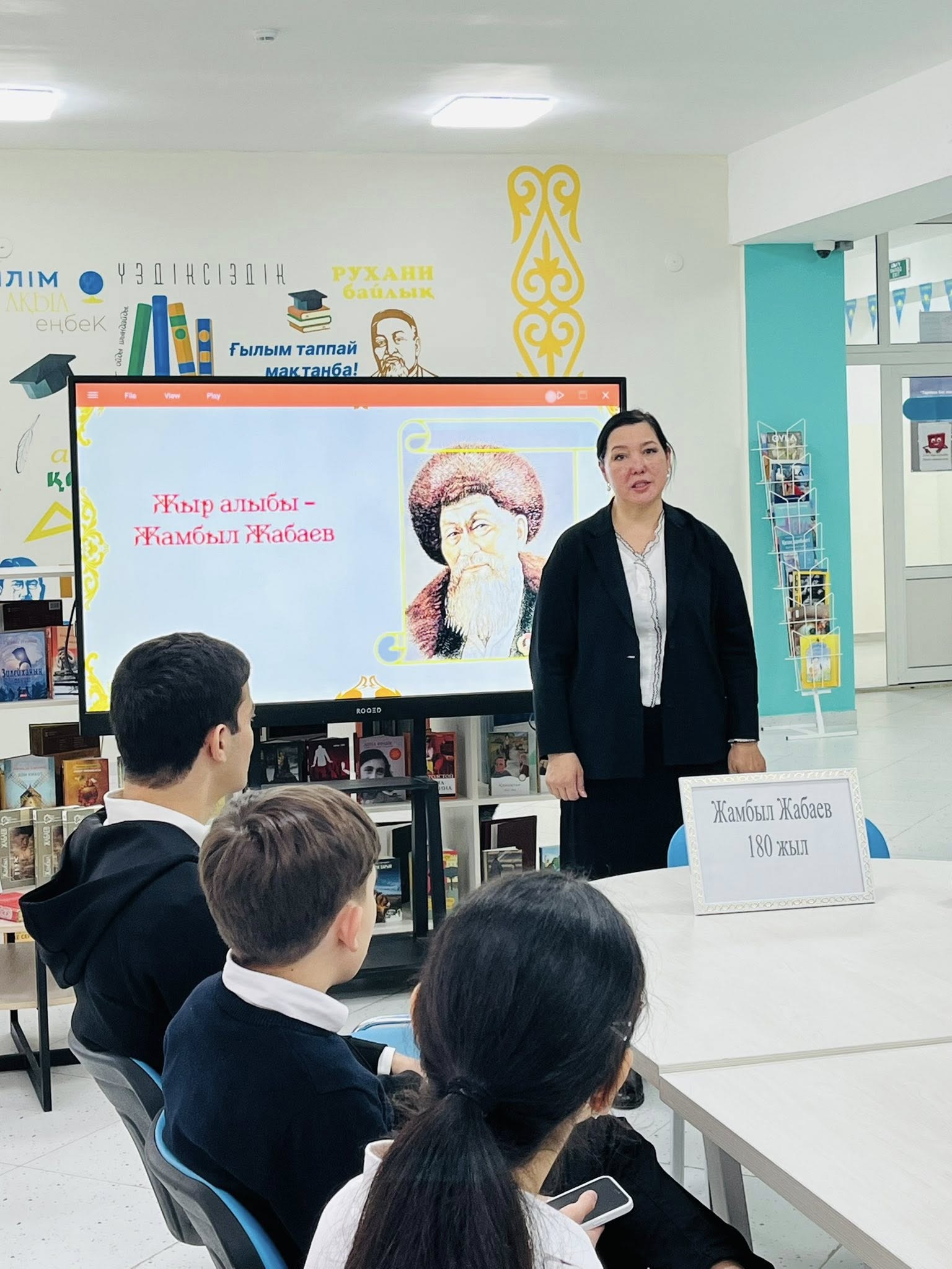 04.02.2026 ж Ө.Жолдасбеков атындағы №9 ІТ лицейінде 8- сынып оқушылары қатысуымен қазақ халқының ұлы ақыны, жыршылық өнердің шебері Жамбыл Жабаевтың туғанына 180 жыл толуына арналған әдеби кеш өтті. Бұл мерейтой оның ел тарихында, әдебиетінде және мәдениетіндегі орнын еске алуға бағытталған. Жамбылдың мұрасы — қазақтың ауыз әдебиетінің дара құндылығы, ол өз заманының көрінісі және азаттық пен гуманизм идеяларының жырланған дауысы ретінде қала береді. Мерейтой оның өнері мен даналығы ұрпақтарға жетіп, елдің рухани күш-қуатын нығайтудағы рөлін насихаттауды мақсат етеді.