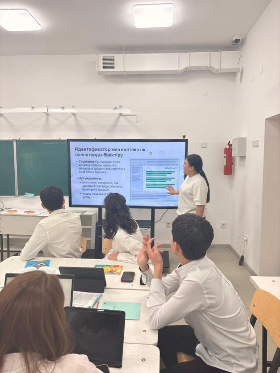 Бүгін Ө.Жолдасбеков атындағы №9 ІТ лицейінде информатика пәнінің мұғалімі Үсен Айғаным Бауыржанқызы 10 А - сынып оқушыларымен «Веб–жобалау» бөлімі бойынша