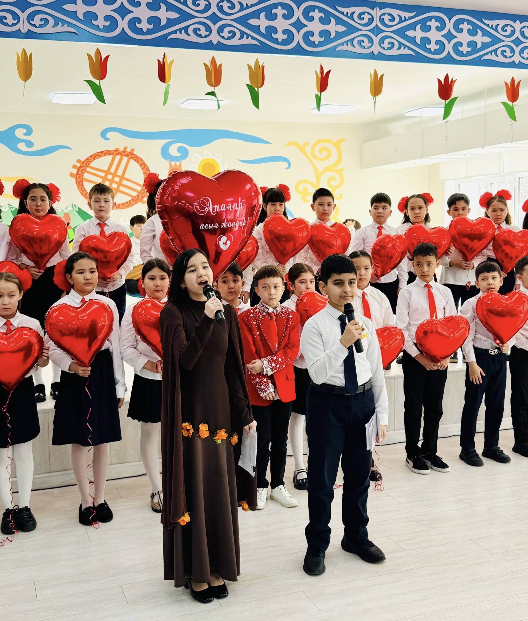 Мерекелік кешті бастауыш сынып оқушылары Нурали мен Дария жылы лебіздерімен ашып, көктемнің шуақты мерекесімен құттықтады. Оқушылар аналар мен ұстаздардың қоғамдағы орны ерекше екенін айтып, жүрекжарды тілектерін білдірді.