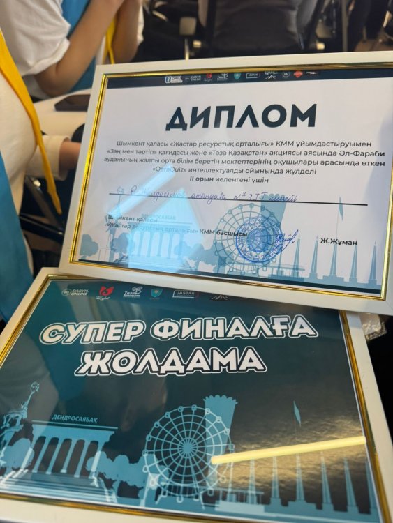 Шымкент қаласы "Жастар ресурстық орталығы" КММ ұйымдастыруымен "Заң мен тәртіп" қағидасы және "Таза Қазақстан" акциясы аясында Әл-Фараби ауданы бойынша қалалық интеллектуалдық сайыста оқушыларымыз 2-орынды иеленіп, СУПЕР ФИНАЛҒА жолдама алды!Құттықтаймыз!