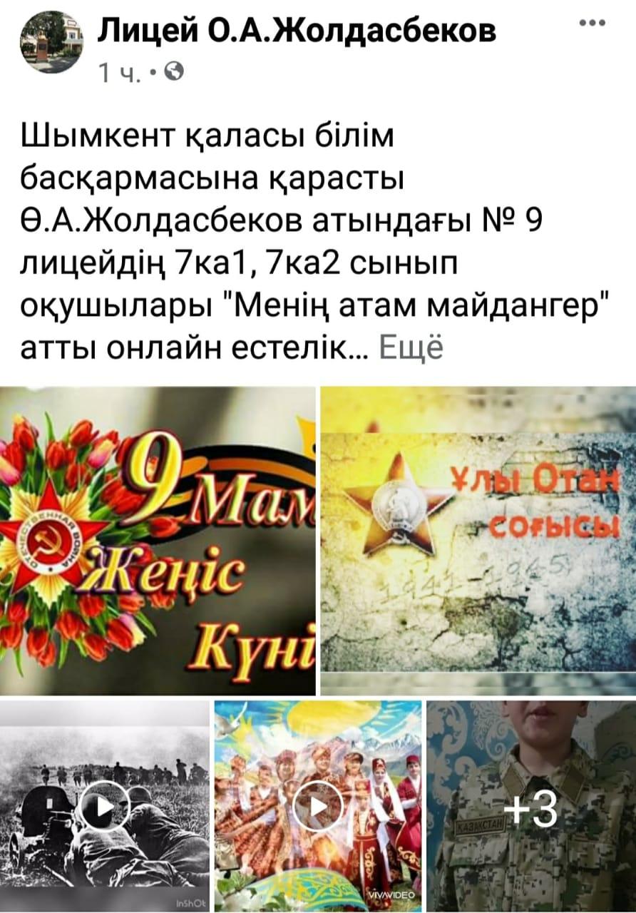 04 мамыр 2020 0 1 2 3 4 5 "Менің атам майдангер" естелік сабақ Шымкент қаласы білім басқармасына қарасты Ө.А.Жолдасбеков атындағы № 9 лицейдің 7ка1, 7ка2 сынып оқушылары "Менің атам майдангер" атты онлайн естелік айту тәрбие сабағын өткізді. Сынып жетекшісі А.С.Кадирбаева.