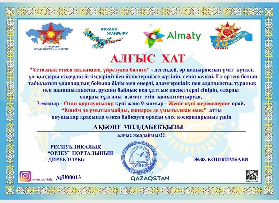 Шымкент қаласы білім басқармасына қарасты Ө.А.Жолдасбеков атындағы № 9 лицейдің 1 кб сынып оқушысы Тойбек Нүрислам " 7 мамыр - Отан қорғаушы күні (Менің Отаным) және 9 мамыр "Ешкім де ұмытылмайды, ешнәрсе де ұмытылмақ емес" мерекелеріне орай оқушылар арасында үздік сүрет жариялағаны үшін ІІ дәрежелі дипломмен марапатталды. Сынып жетекшісі А.М.Пернебекова.