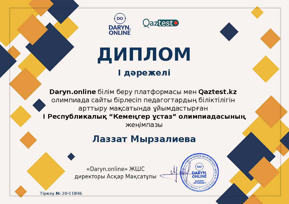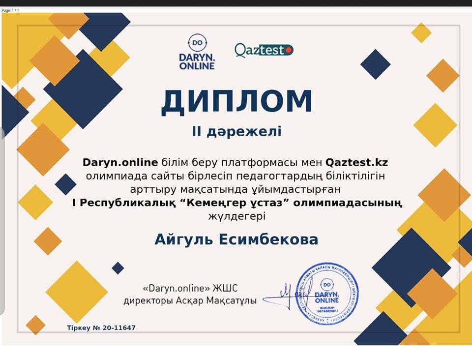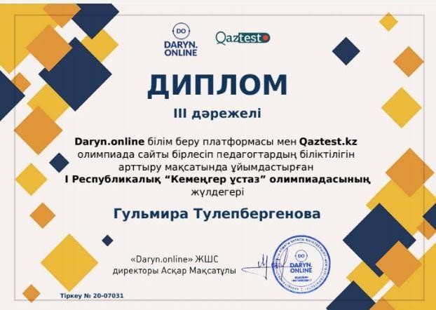 Шымкент қаласы білім басқармасына қарасты Ө.А.Жолдасбеков атындағы № 9 лицейдің мұғалімдері DARYN.ONLINE білім беру платформасы мен Qaztest.kz олимпиада сайты бірлесіп педагогтардың біліктілігін арттыру мақсатында ұйымдастырған І Республикалық "КЕМЕҢГЕР ҰСТАЗ" олимпиадасына қатысып, І, ІІ, ІІІ дәрежелі дипломдарымен марапатталды.#біз#біргеміз#