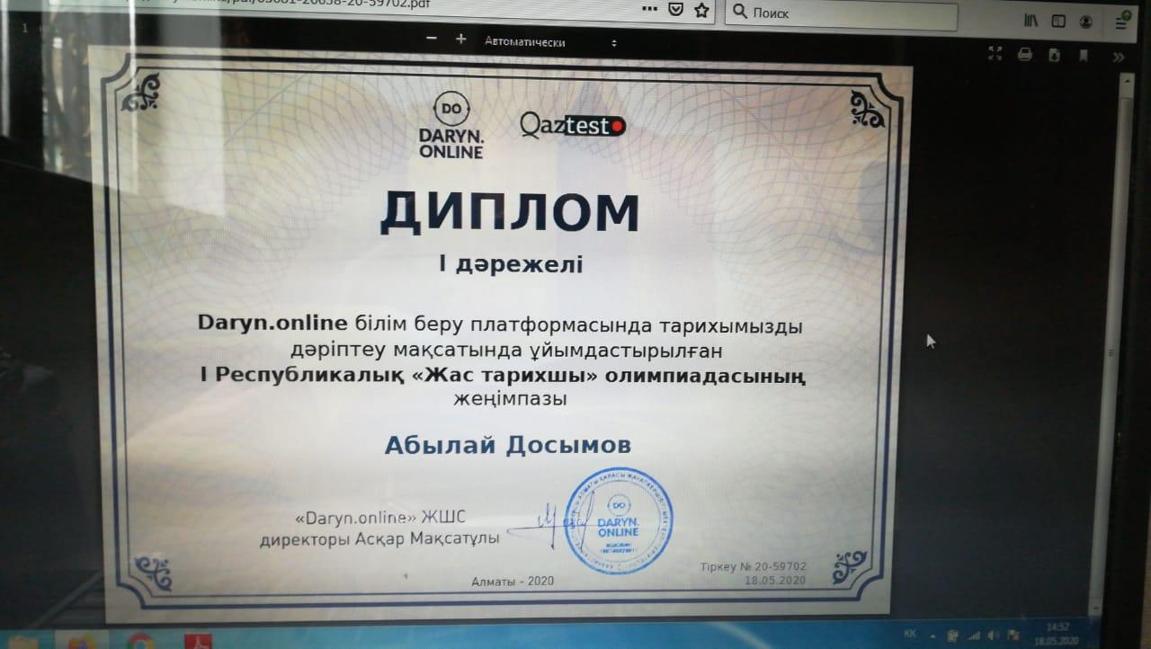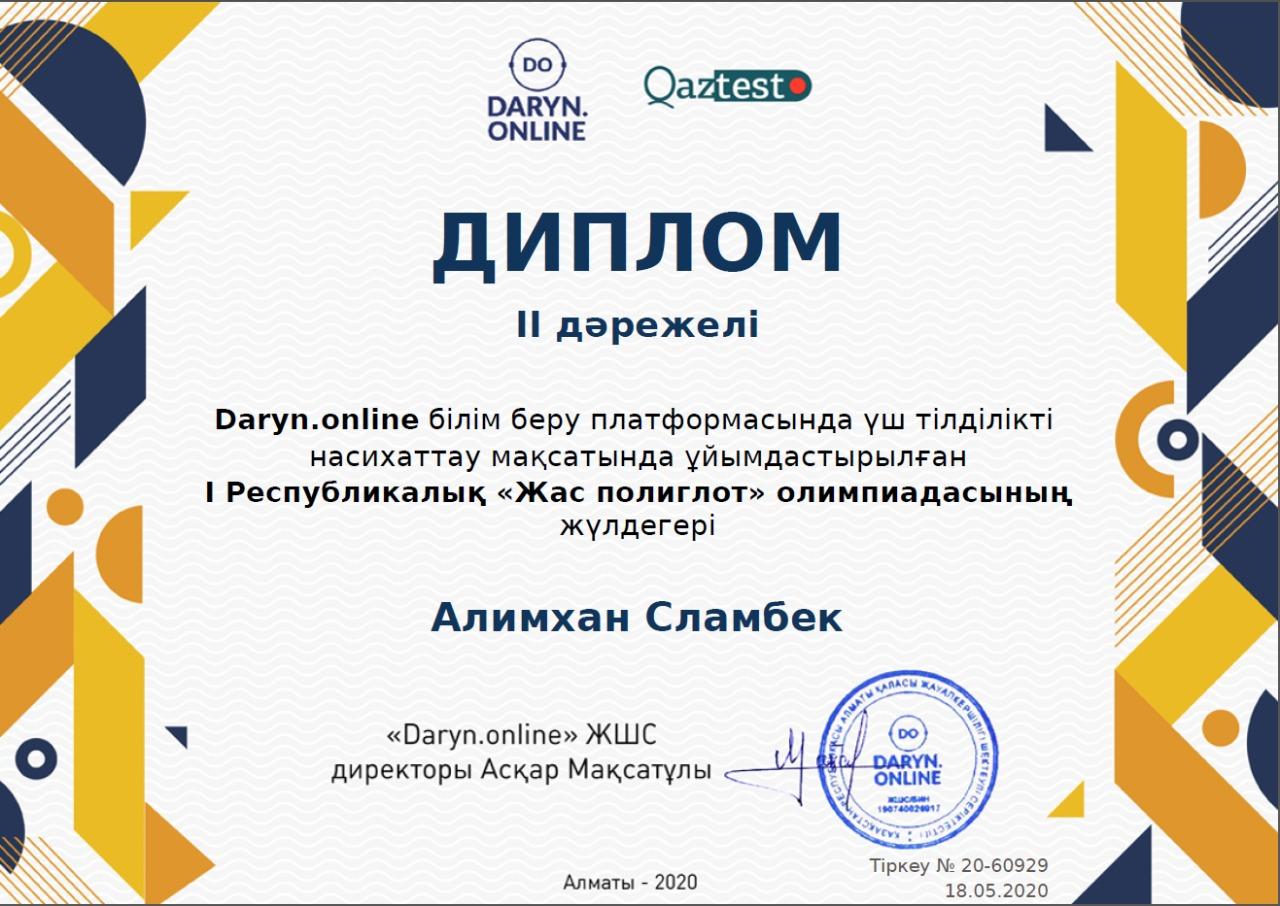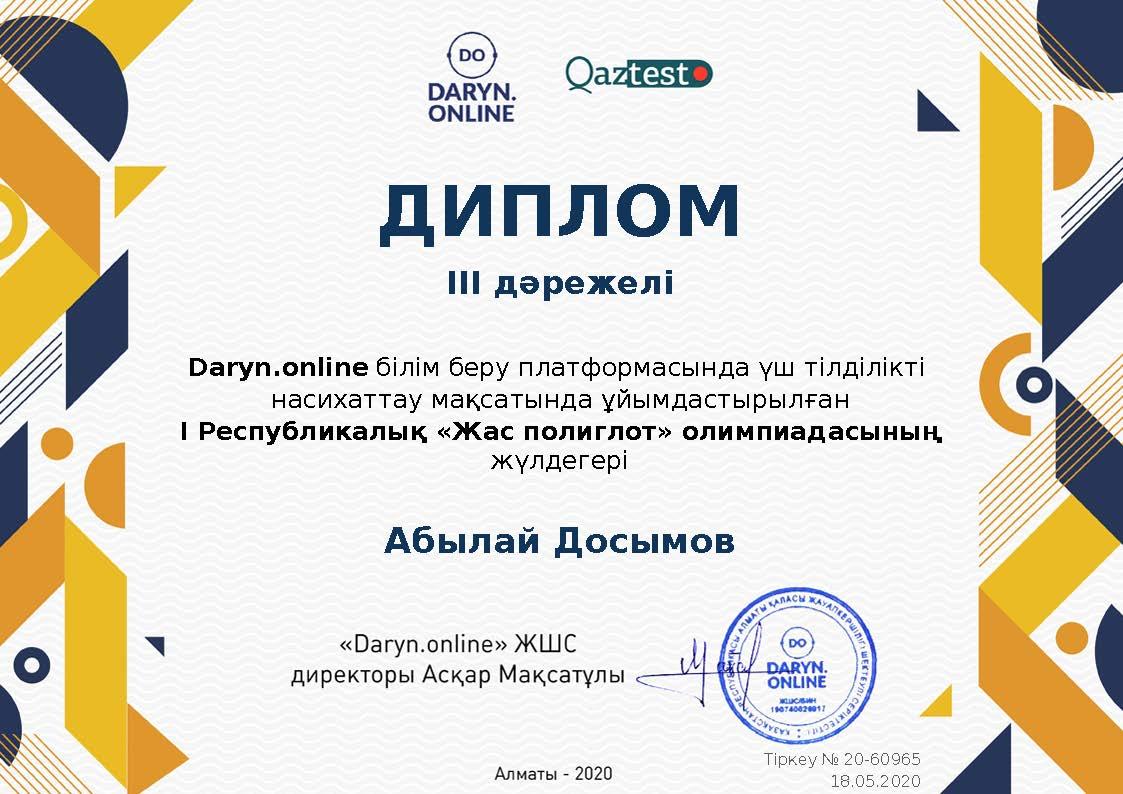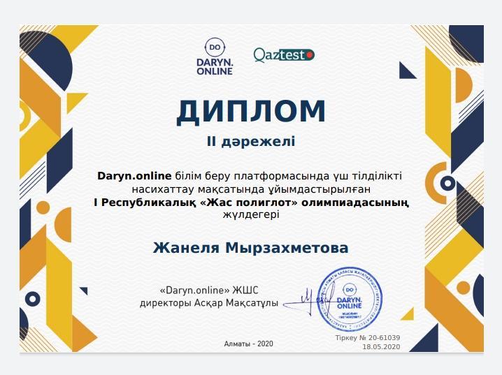 18 мамыр 2020 0 1 2 3 4 5 "Жас полиглот" Дарын.онлайн олимпиада Шымкент қаласы білім басқармасына қарасты Ө.А.Жолдасбеков атындағы № 9 лицейдің оқушылары Daryn.online платформасындағы БІРІНШІ РЕСПУБЛИКАЛЫҚ "Жас полиглот" атты олимпиадасына қатысып, жүлделі орындарға ие болды.