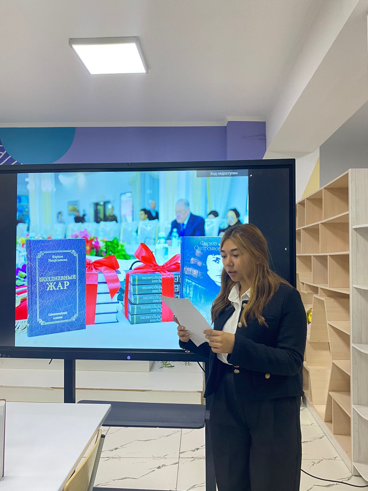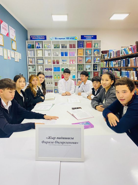 Шымкент қаласы білім басқармасына қарасты Ө.А.Жолдасбеков атындағы №9 IT лицейінде 11.10.2024ж " Біртұтас тәрбие" бағдарламасы аясында "Балалар кітапханасы" жобасын іске асыру мақсатында ақын Фариза Оңғарсынованың 85 жыл толуына орай танымдық сабақ өткізілді.