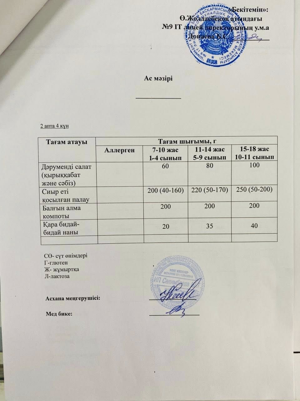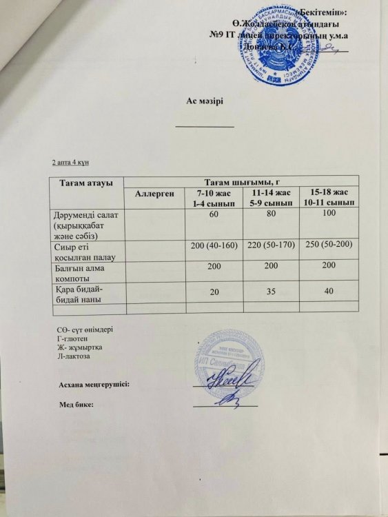 Ас мәзірі жақын арада жаңартылып, қазіргі таңда күнделікті дайындалатын тағамдар бекітілген ас мәзіріне толық сәйкес жүзеге асырылуда. Бұл өзгеріс оқушылардың дұрыс әрі сапалы тамақтануын қамтамасыз ету, денсаулығын нығайту және күнделікті оқу үдерісіне қажетті қуат алу мақсатында енгізілді.