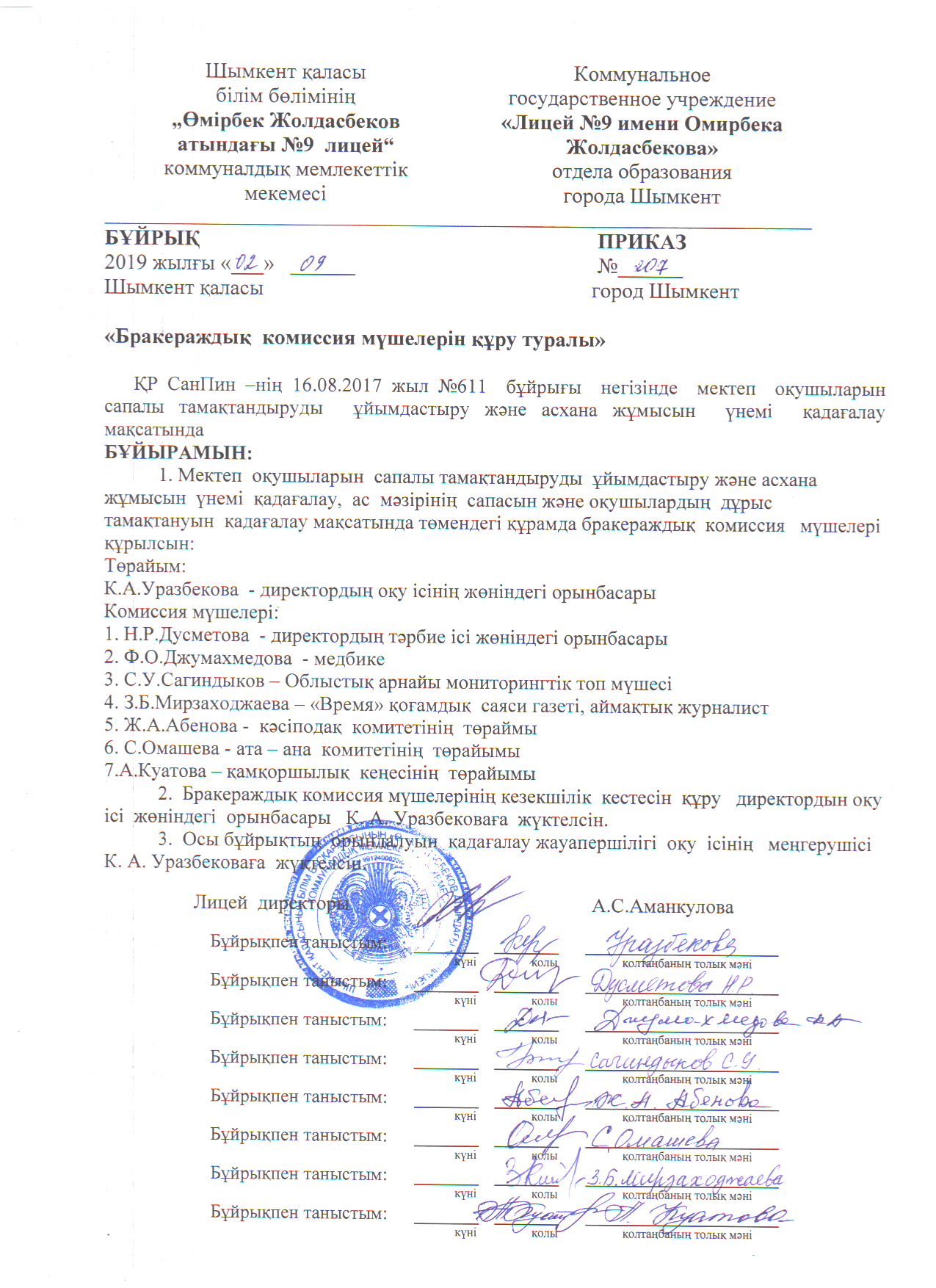 Состав бракеражной комиссии » «Ө.Жолдасбеков атындағы №9 IT лицейі»